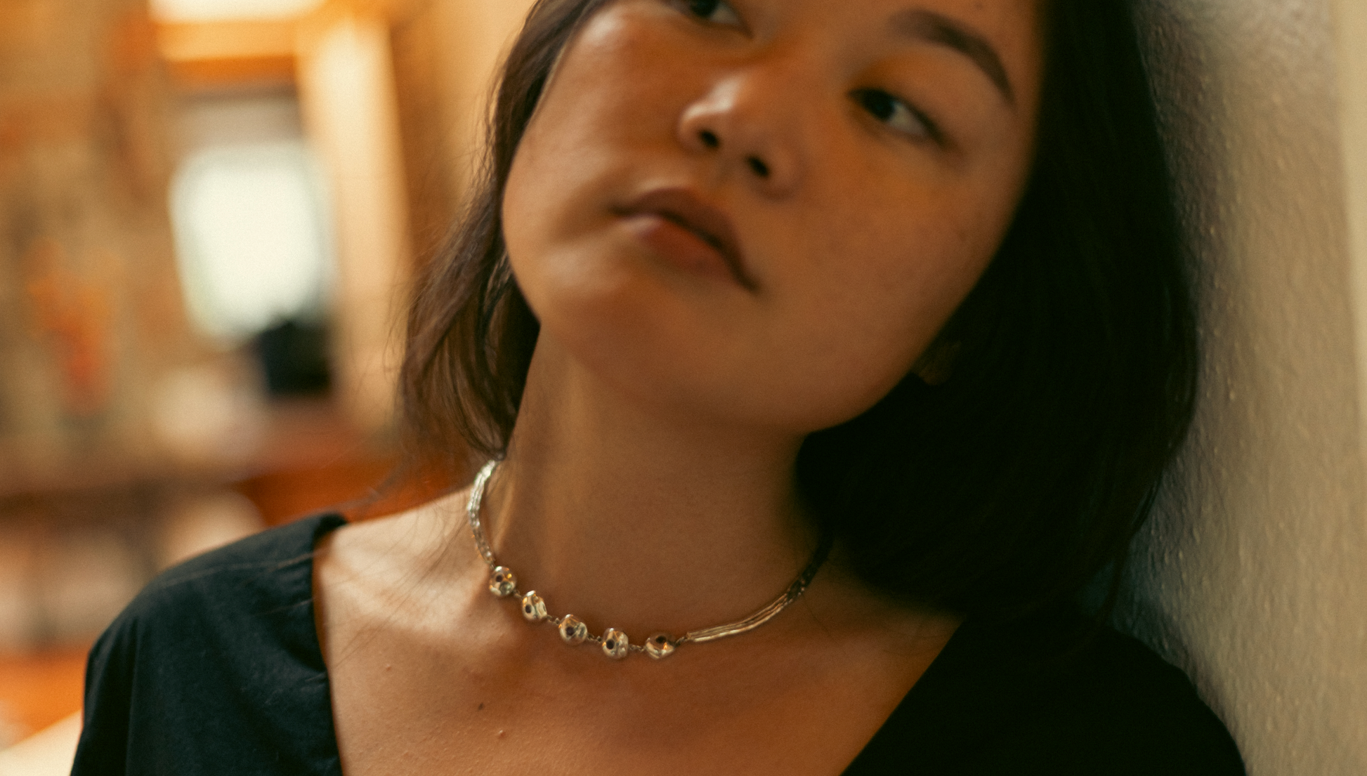 Necklace made from silver recovered from photographic waste, set with rubies.